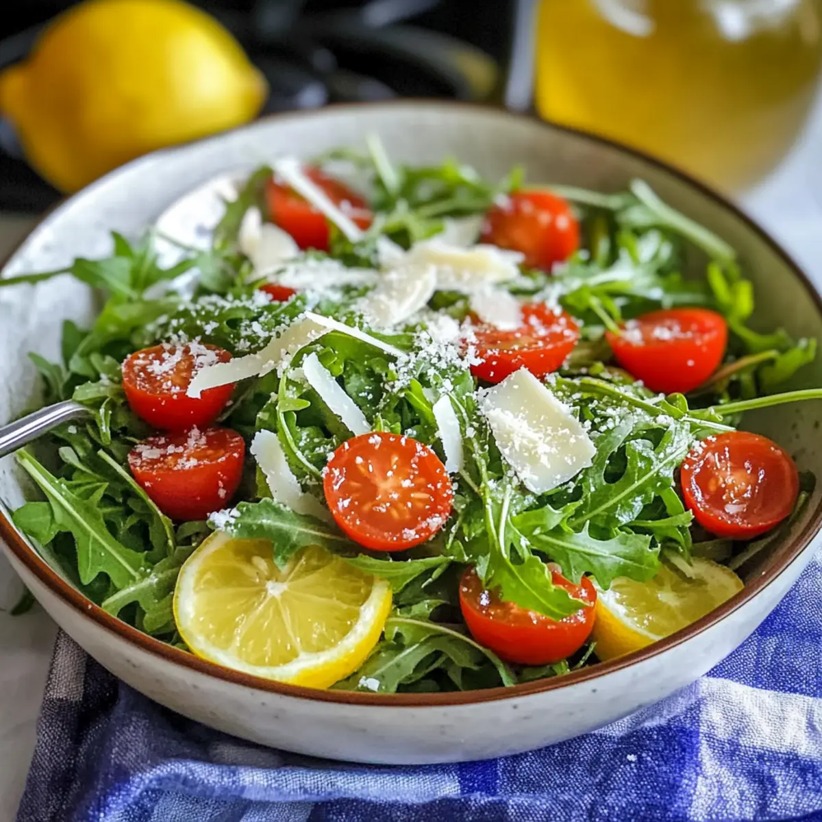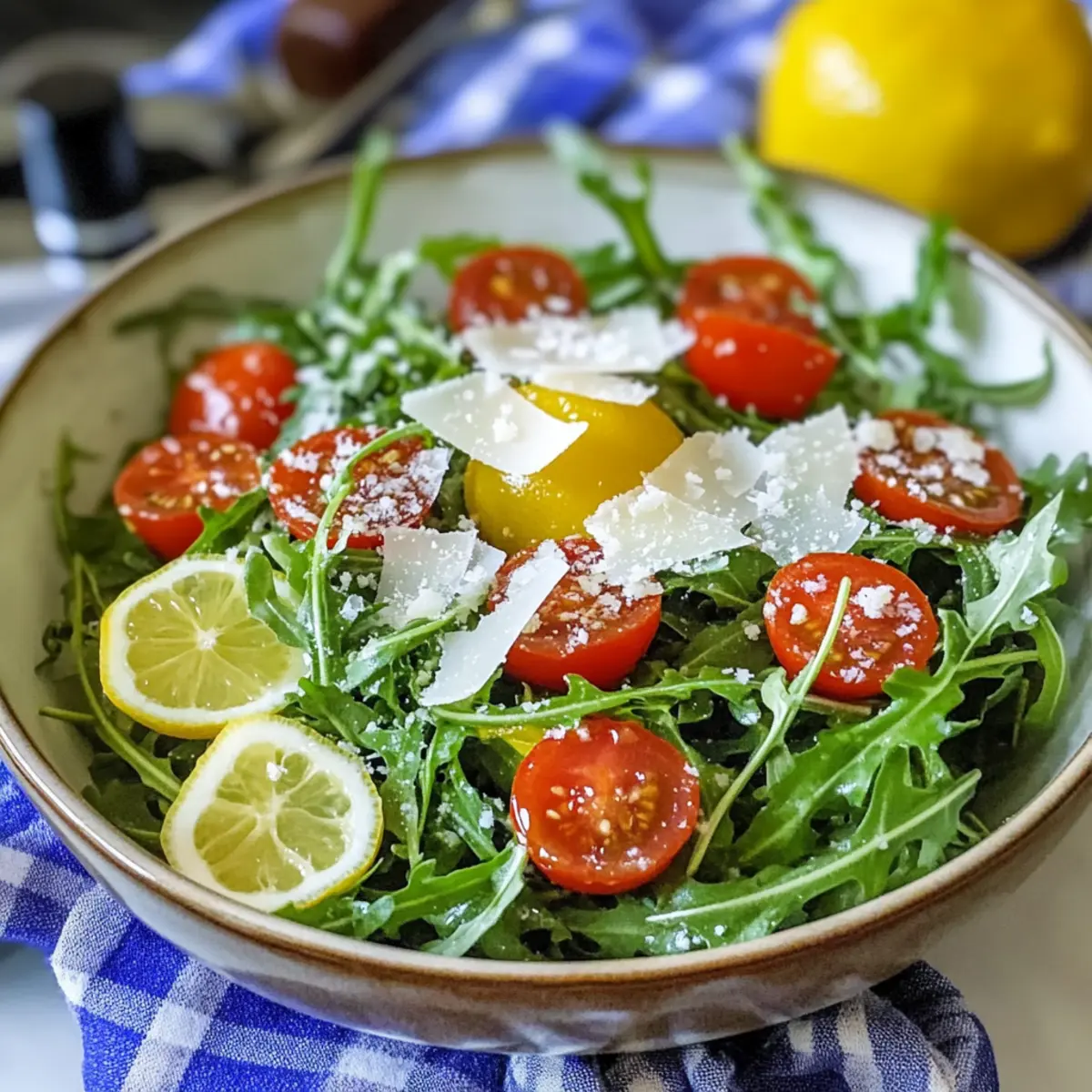 As I tossed the vibrant greens into my bowl, the peppery scent of fresh arugula filled the air, igniting my appetite for something light and refreshing. This Fresh Arugula Salad with Zesty Lemon Vinaigrette is not just a quick meal; it’s a delightful escape from my usual routine. With the tangy brightness of lemon dancing in the sumptuous vinaigrette, this salad is an excellent choice for a breezy lunch or a lively side to elevate any dinner. The best part? It comes together in minutes and is packed with nutrients, making it a guilt-free indulgence. Imagine savoring each bite as the juicy cherry tomatoes burst in your mouth, perfectly complemented by a sprinkle of Parmesan. Are you ready to whip up this refreshing creation and bring a little sunshine to your plate?