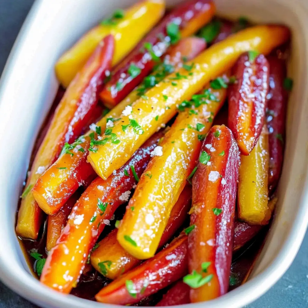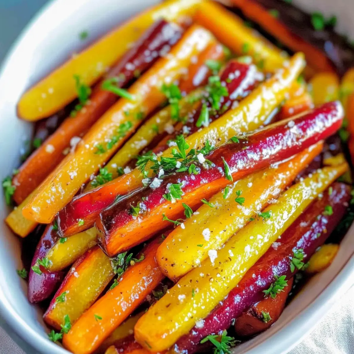 Once roasted, remove the dish from the oven and let the carrots cool for about 5 minutes. This resting period helps the flavors settle. Before serving, sprinkle with coarse salt for an extra boost of flavor, and garnish with fresh parsley if desired, adding a pop of color to your vibrant side dish.