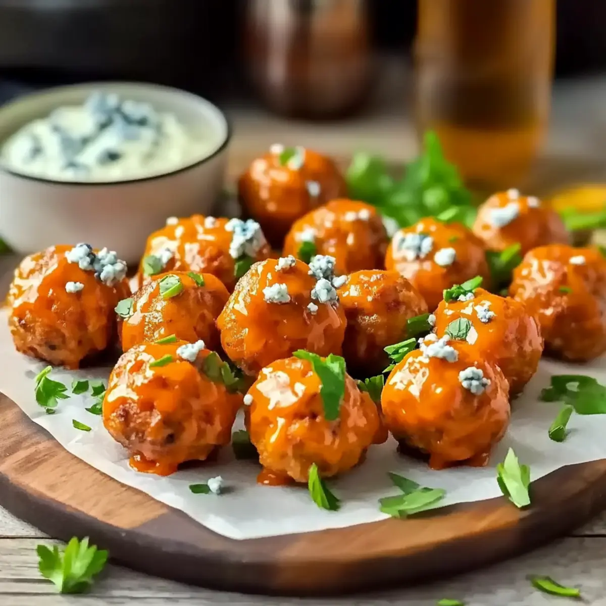 Juicy Buffalo Chicken Meatballs with Creamy Blue Cheese Sauce