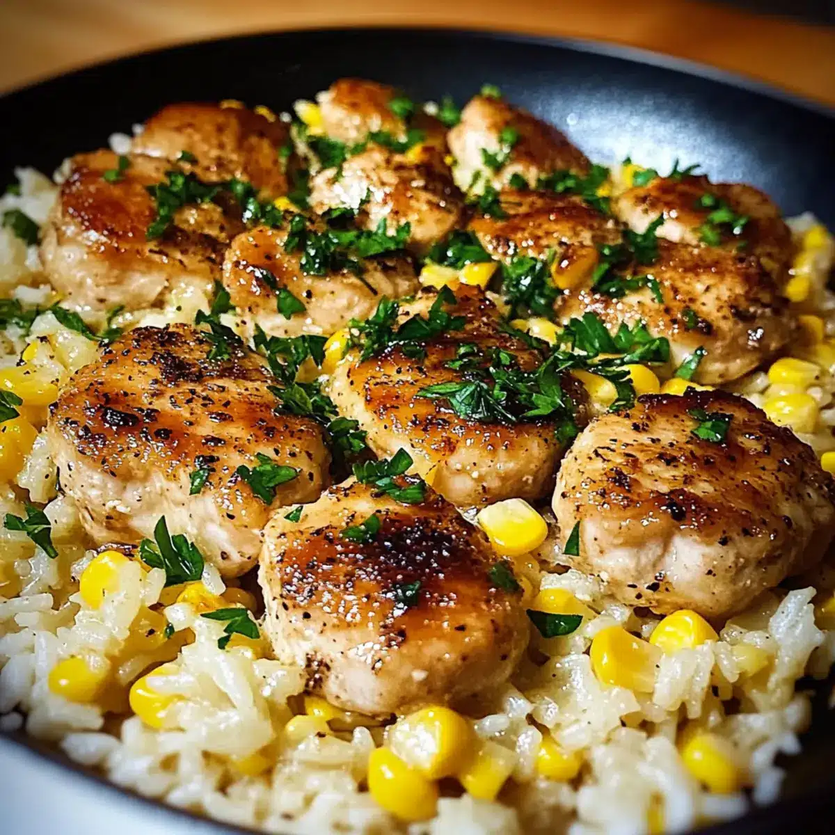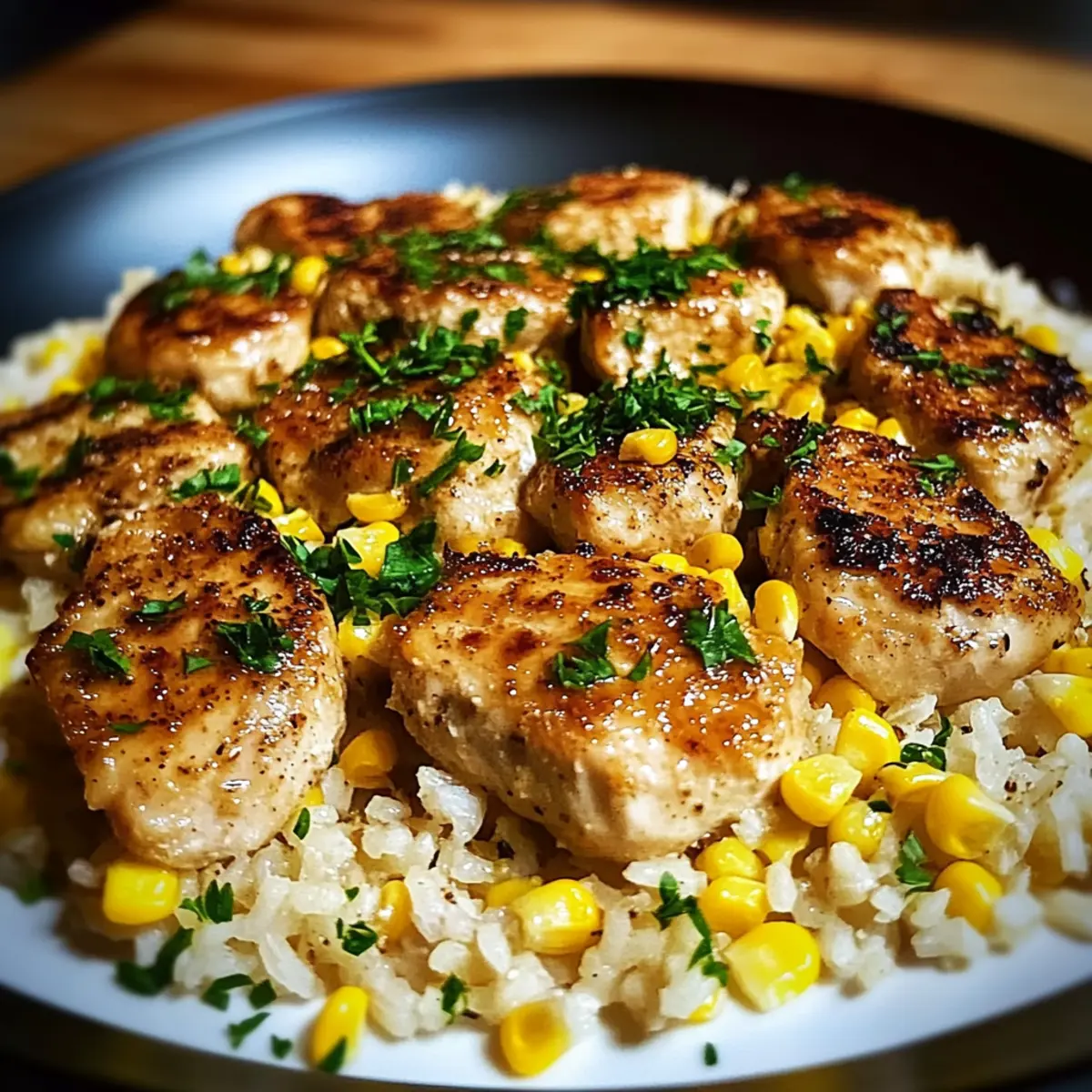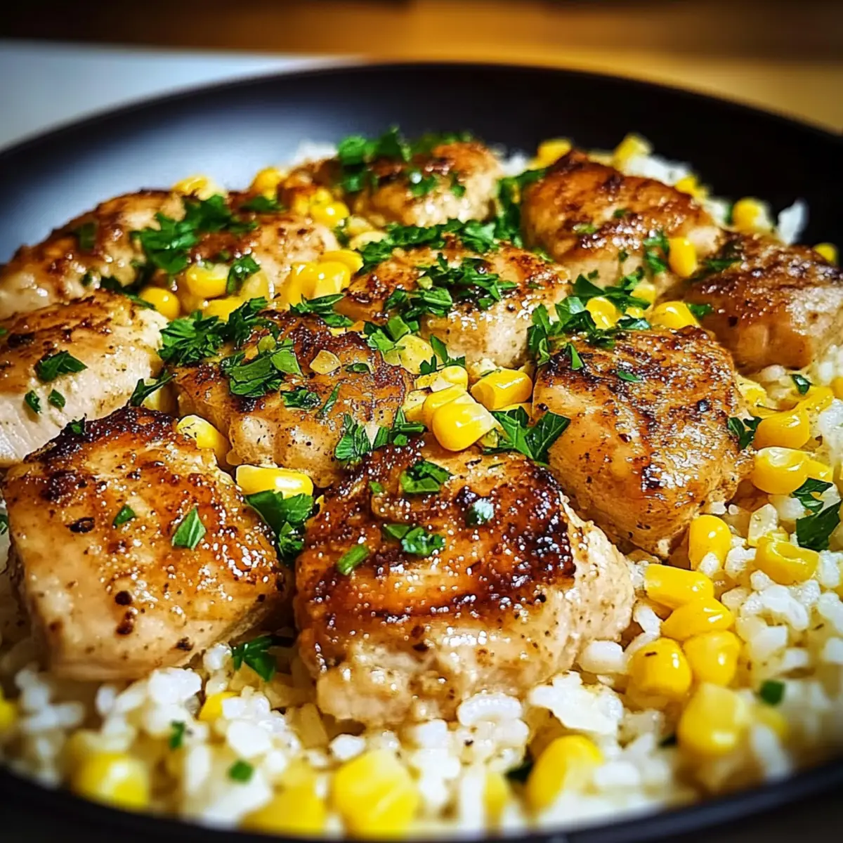 Return the seared chicken to the skillet, nestling it into the warm rice mixture. Let it simmer for an additional 2–3 minutes, allowing the chicken to absorb the flavors. As the chicken melds with the creamy rice and corn, the aromas will fill your kitchen, promising a delicious meal ahead.