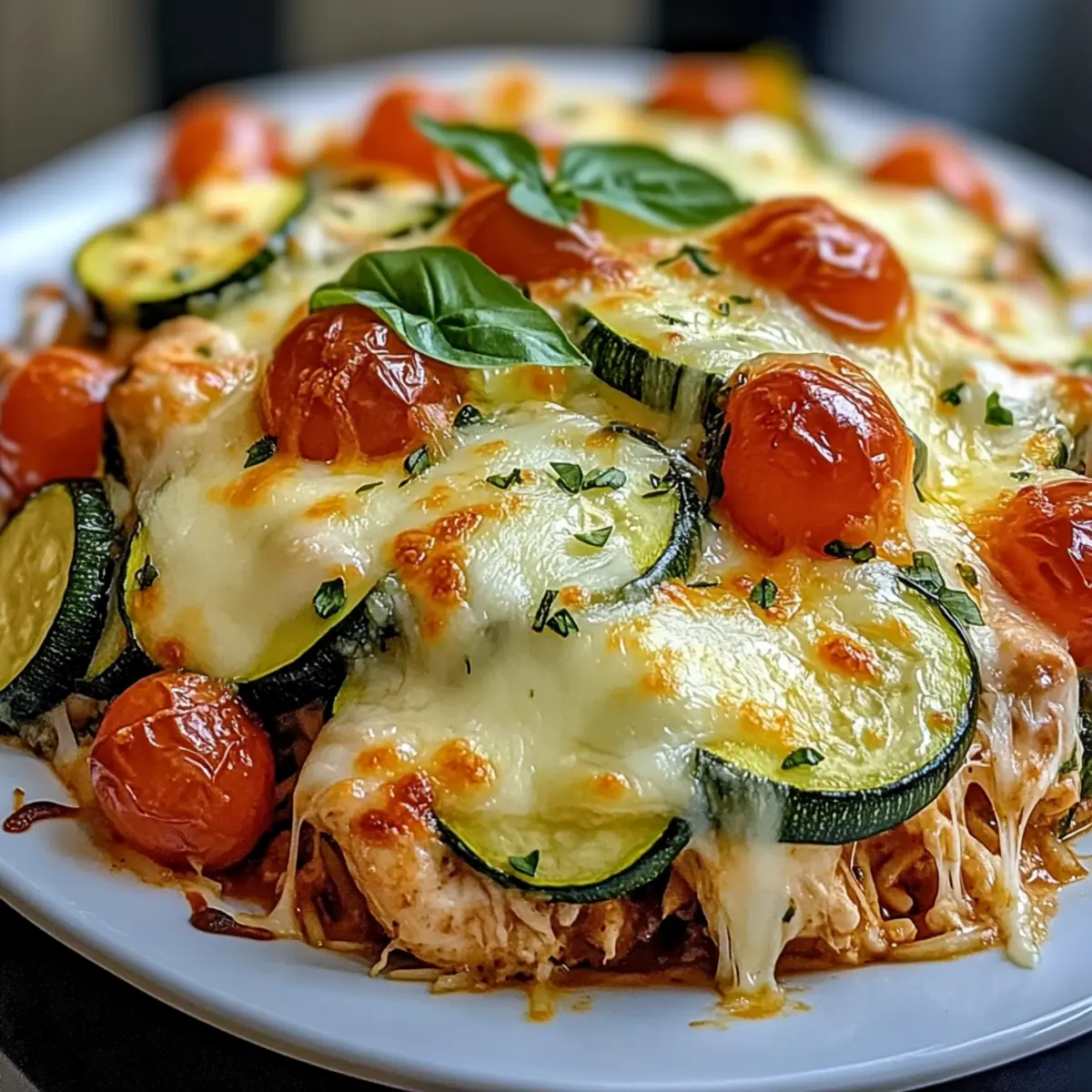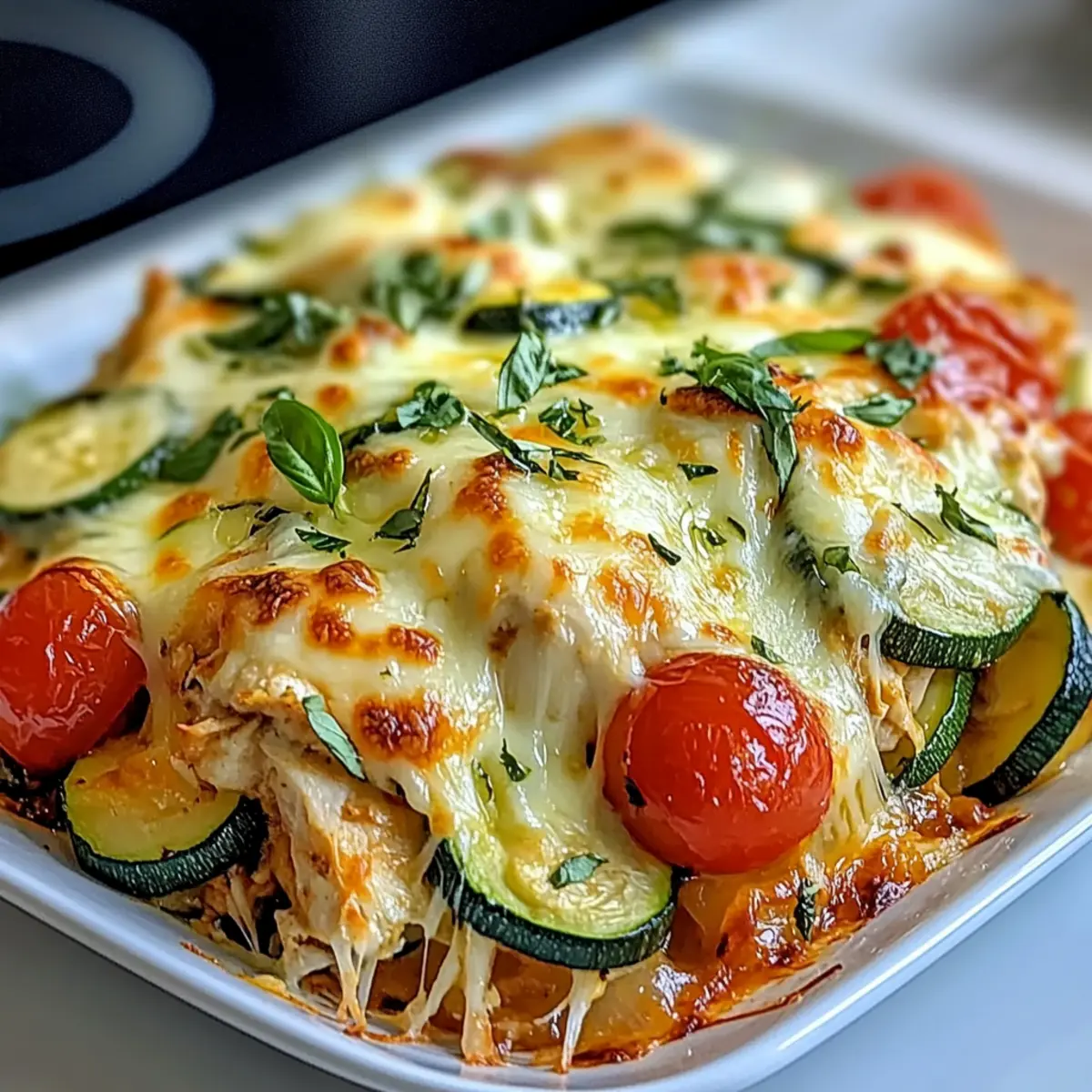Once out of the oven, allow the Chicken Zucchini Bake to cool for a few minutes. This resting time helps set the dish for easier serving. For a beautiful finish, consider garnishing with fresh basil before serving, adding a pop of color and flavor to your meal.