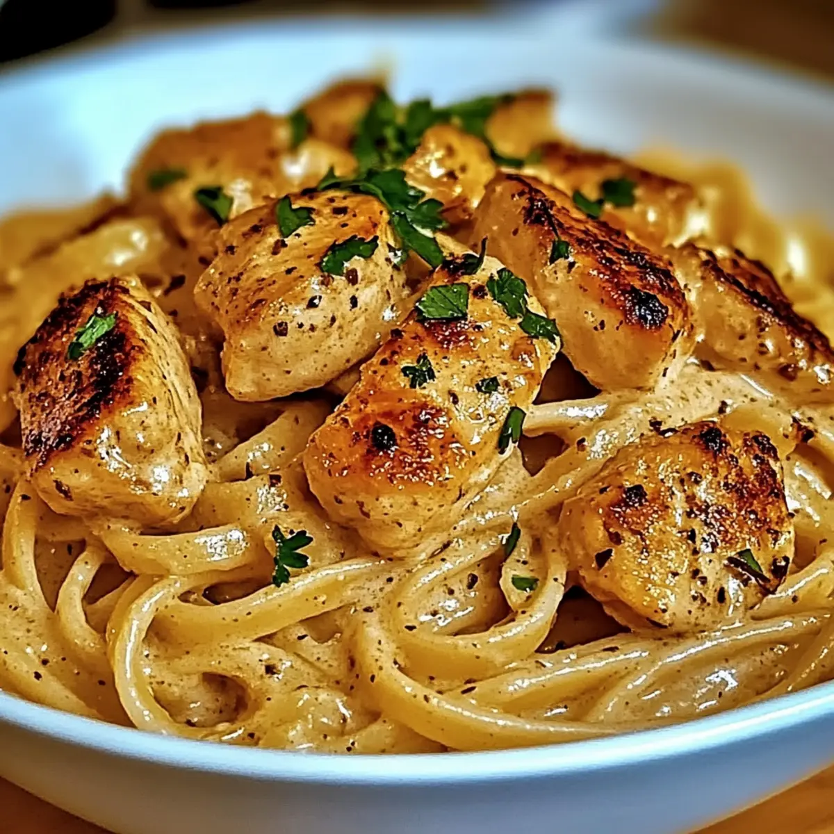 Pour in the heavy cream and sprinkle in the Parmesan cheese, stirring continuously until the sauce thickens—this should take about 3-4 minutes. Keep an eye on the heat to ensure it doesn’t boil too vigorously, as you want a rich, creamy texture enveloping the Chicken Linguine.