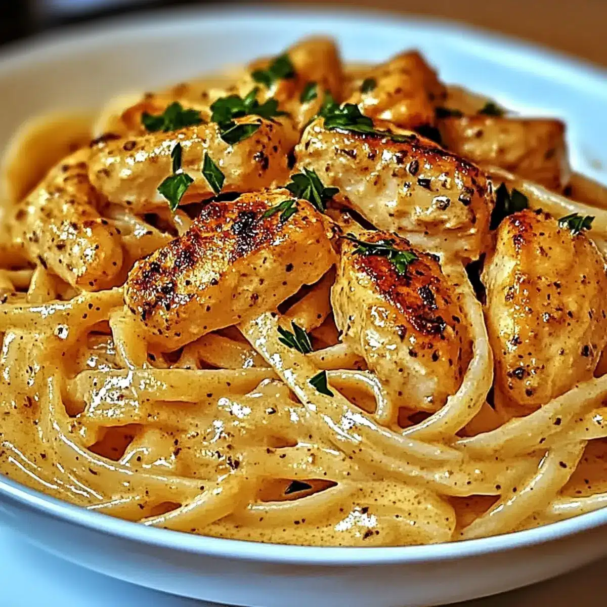 Simmer the Cowboy Butter Chicken Linguine for an additional 1-2 minutes, stirring in freshly chopped parsley for a burst of color and flavor. Serve hot, garnished with lemon wedges on the side, allowing guests to add a zesty final touch to their plates. Enjoy this comforting one-pan delight!