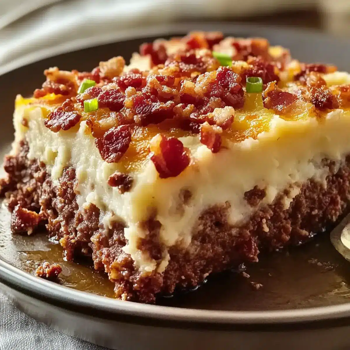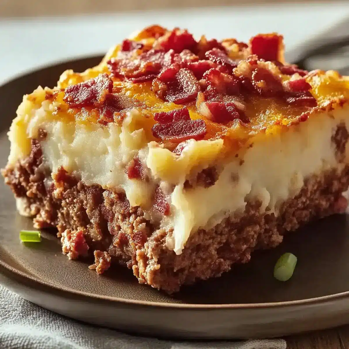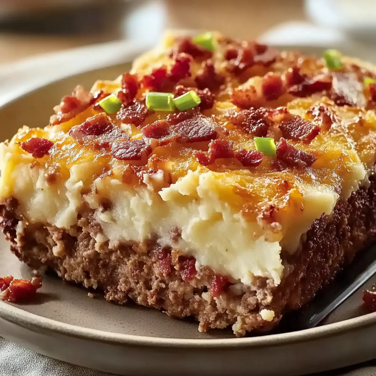 - Spread the creamy mashed potatoes over the cooked meatloaf, then sprinkle with bacon and green onions.