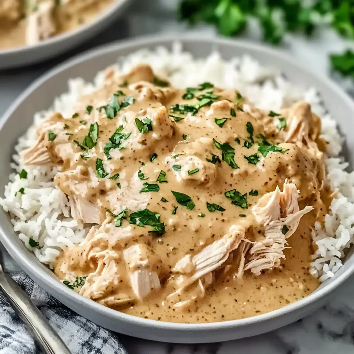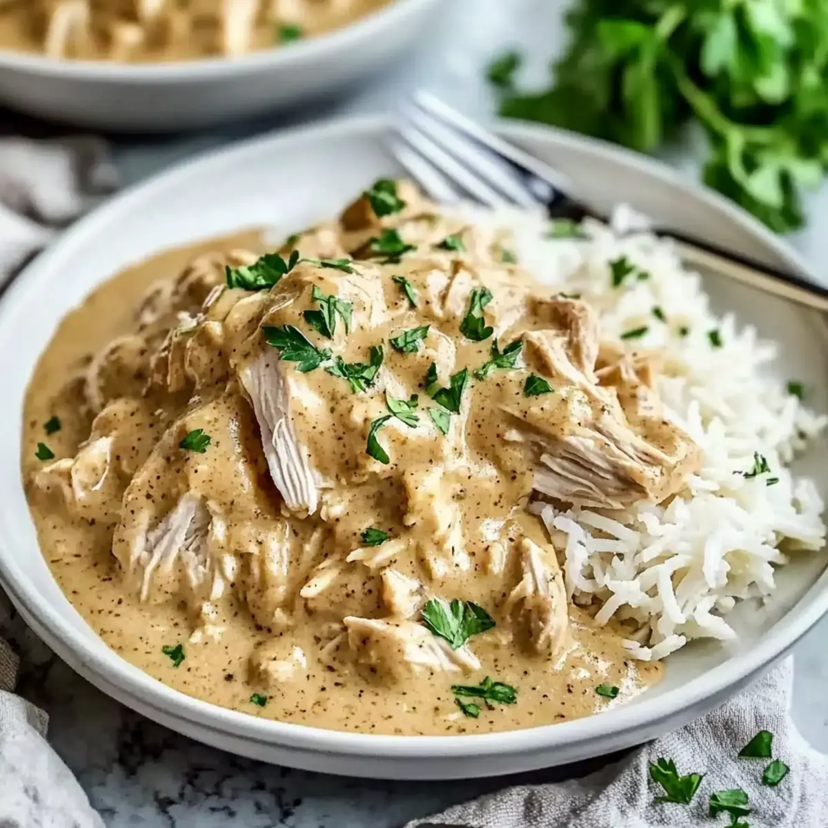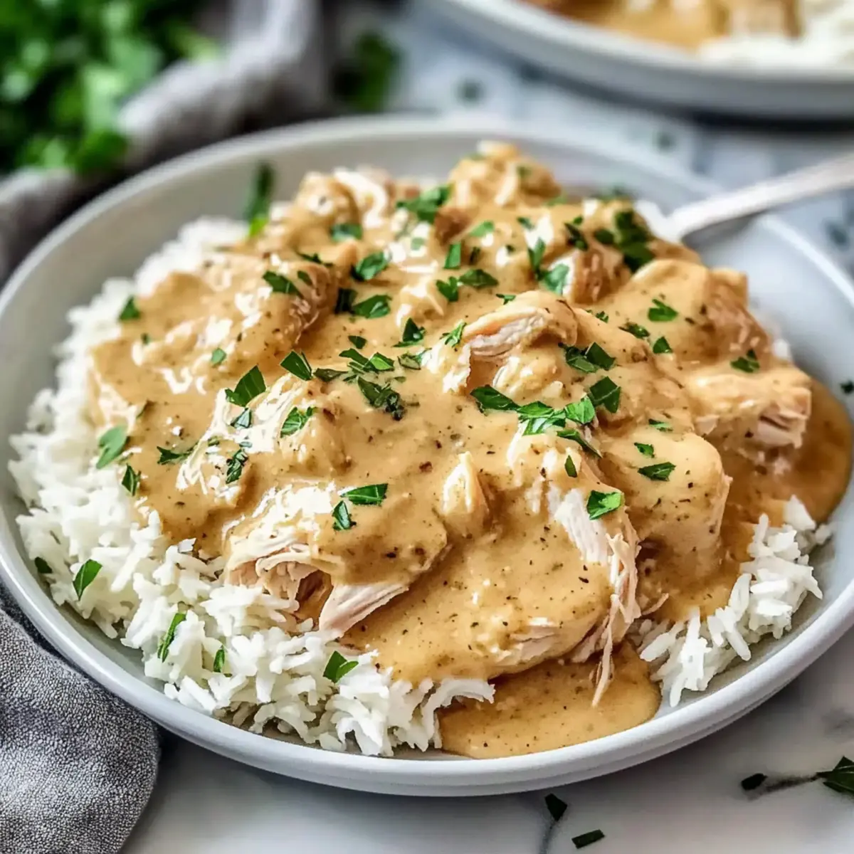 Spoon generous portions of the succulent chicken and velvety gravy over a bed of warm rice or your choice of side. For an added touch of freshness and color, garnish your dish with freshly chopped parsley. Now your slow-cooked masterpiece is ready to be shared and enjoyed around the dinner table!