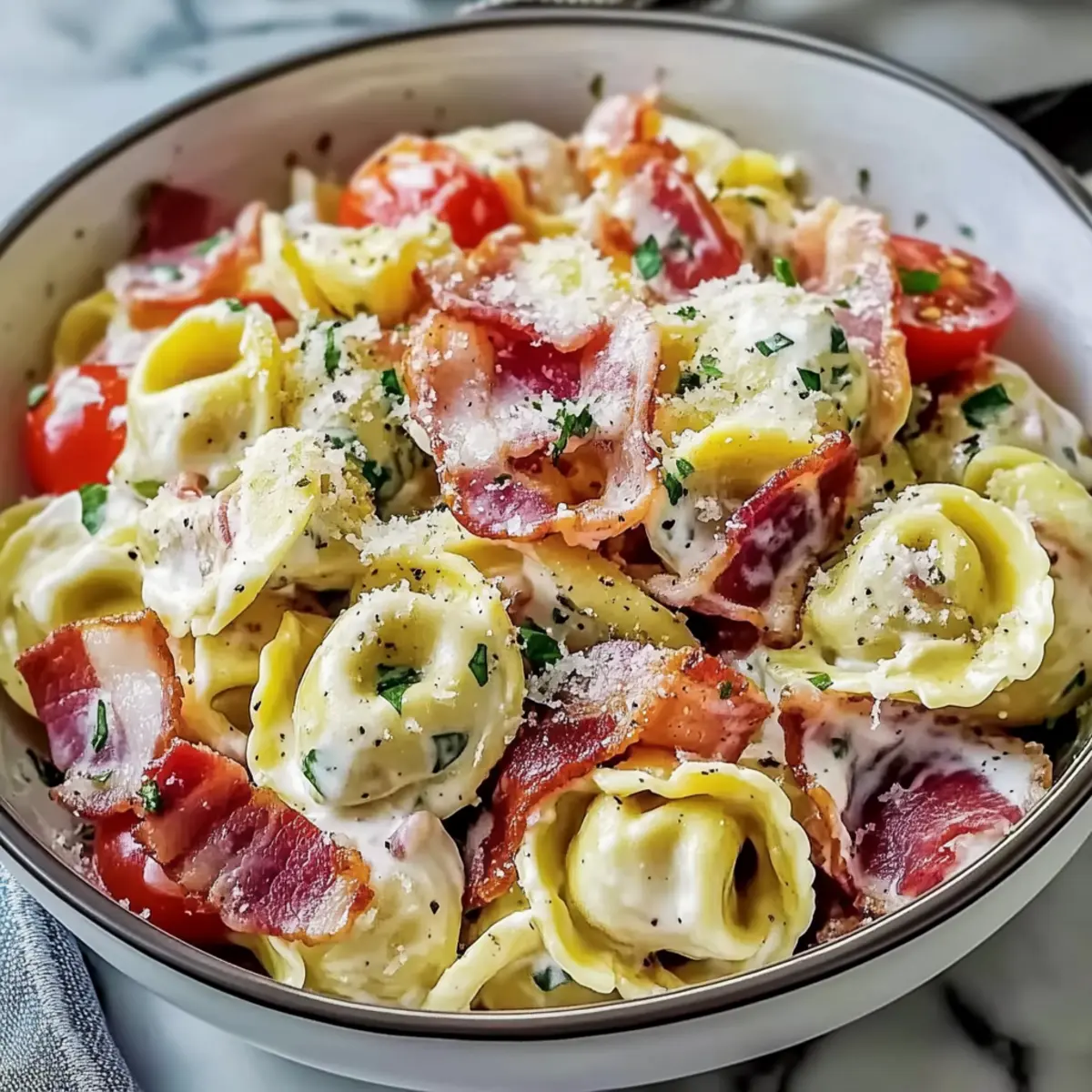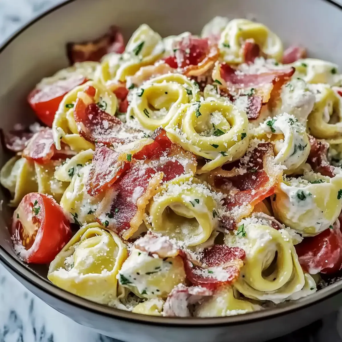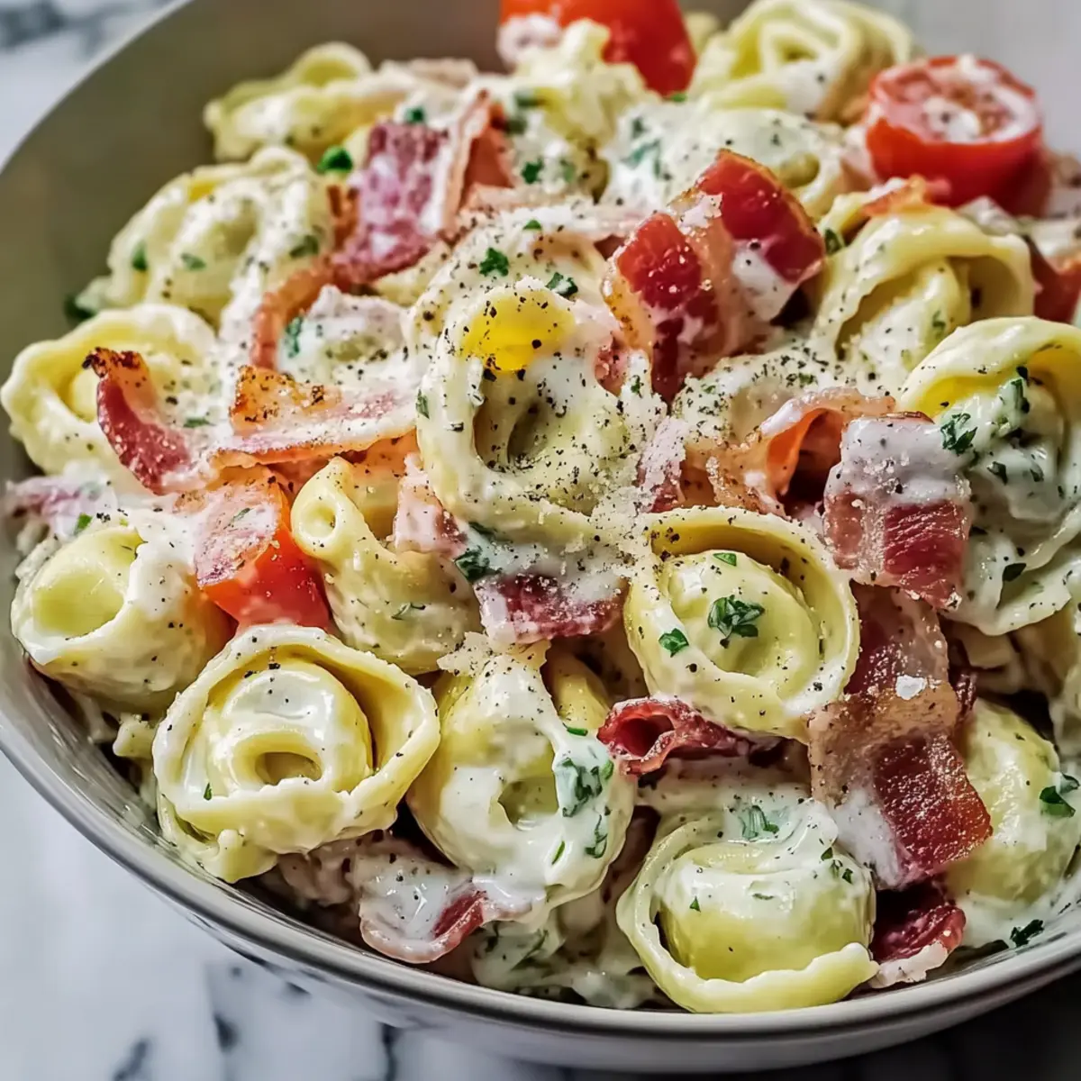 - Add the drained tortellini, sliced pepperoncini, grated Parmesan cheese, finely chopped red onion, and sliced tomatoes. Fold in the cooled bacon pieces.