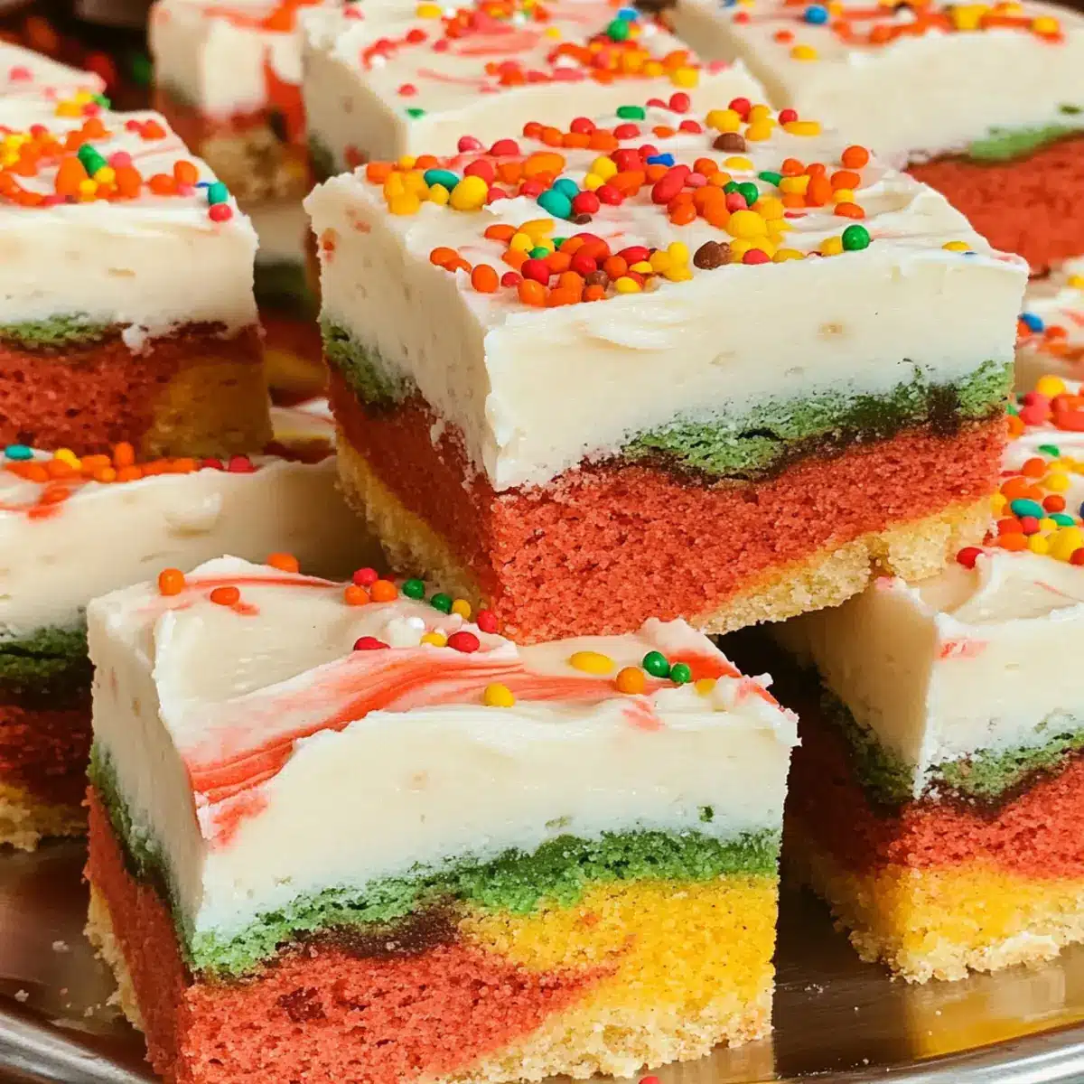 - Mix frosting ingredients and spread over cooled bars. Decorate with festive sprinkles.