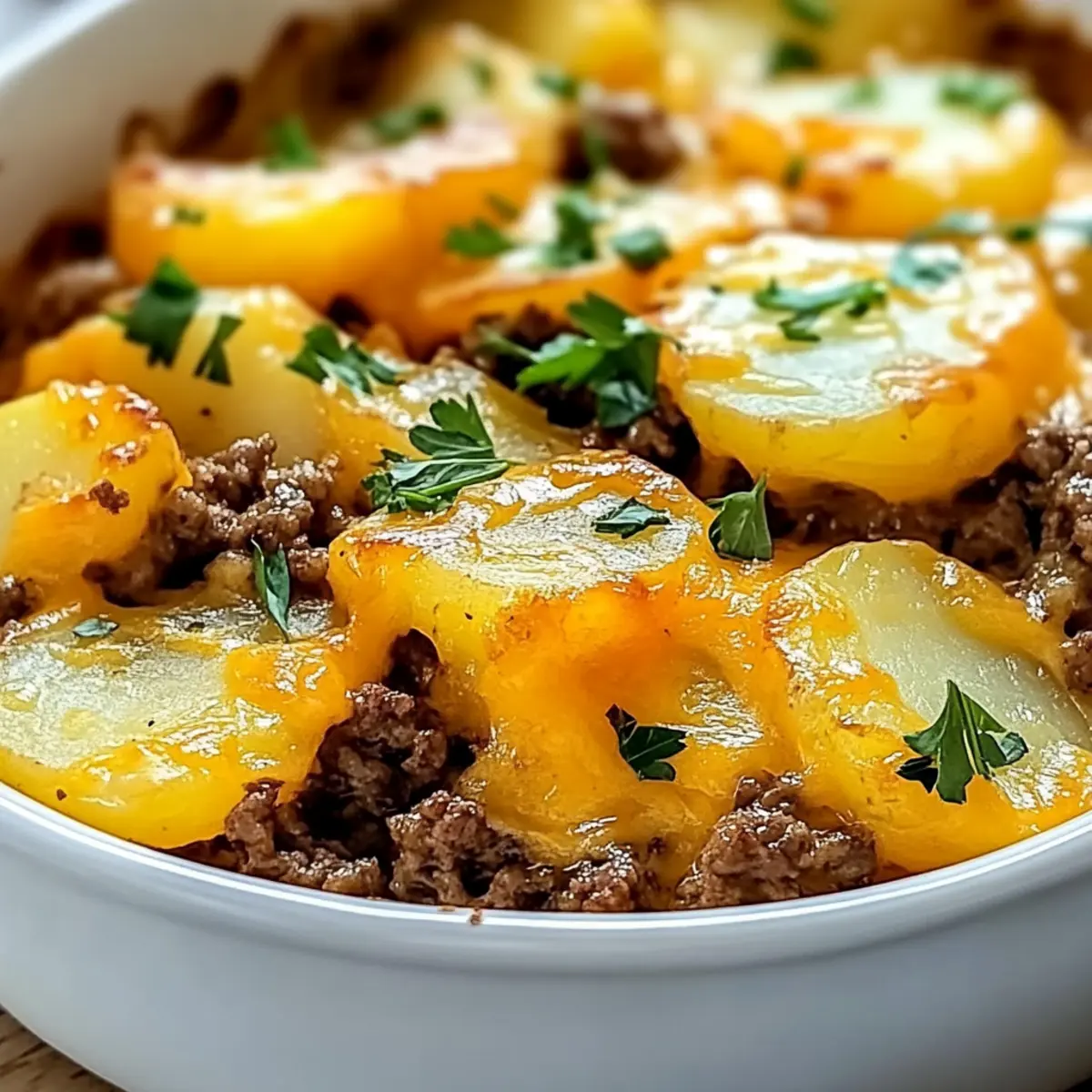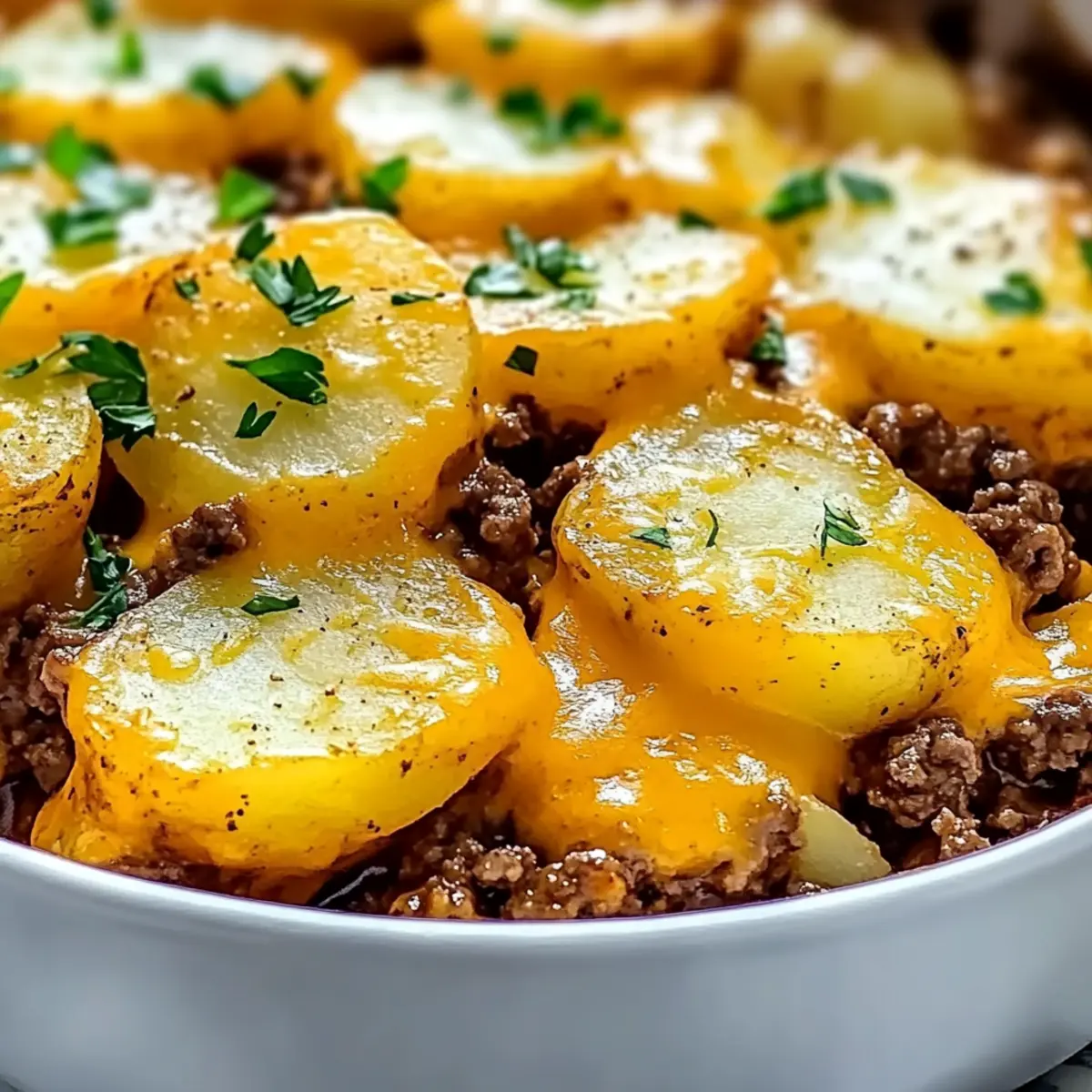 Comforting Layers: This dish is a warm hug on a plate, featuring juicy ground beef, tender potatoes, and melted cheese.