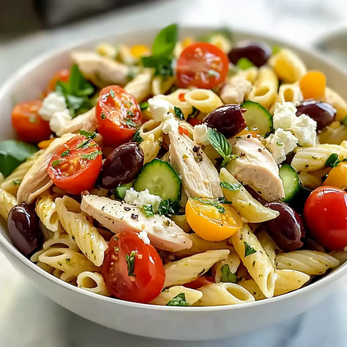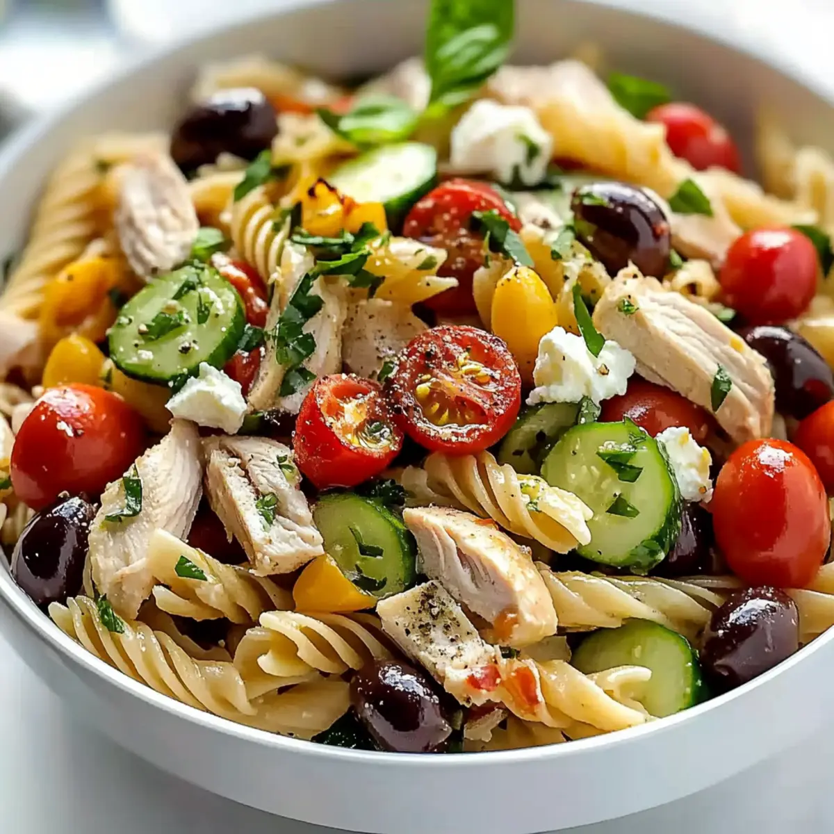 Add the cooled pasta and diced chicken to the bowl containing the vegetables. Gently toss everything together, and then fold in the crumbled feta cheese and Kalamata olives. Be careful not to break the feta too much as you mix; a light hand will keep your Mouthwatering Mediterranean Chicken Pasta Salad looking vibrant and inviting.