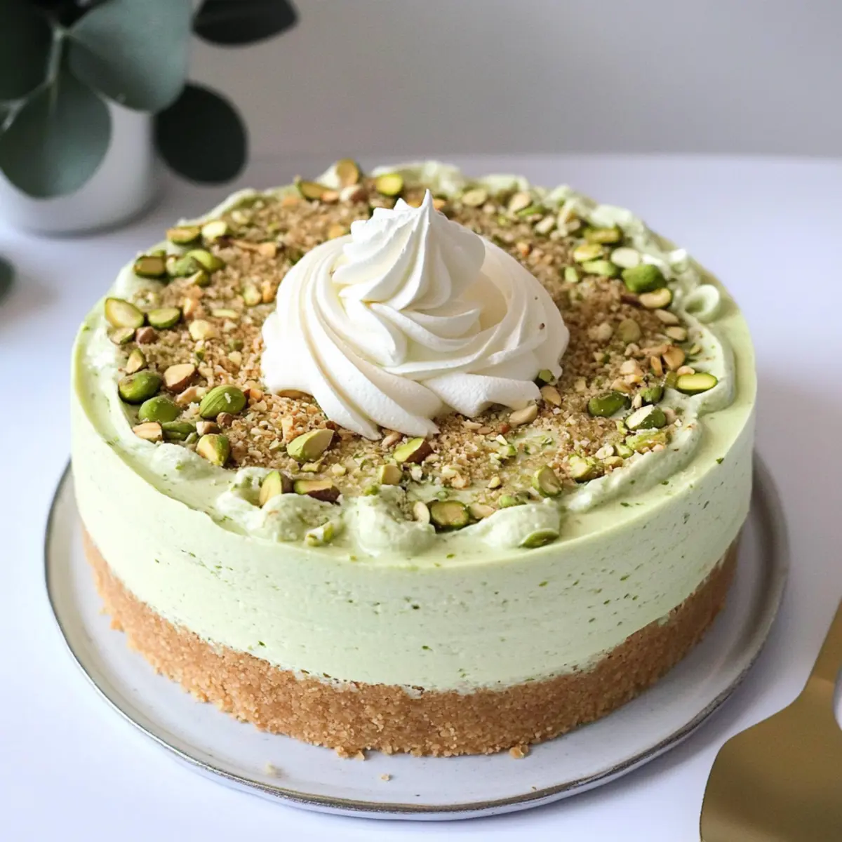 - Spread or pipe the freshly whipped cream over the chilled cheesecake. Sprinkle the top with chopped pistachios for added crunch and visual appeal. Slice and serve your delightful no bake pistachio cheesecake cold.