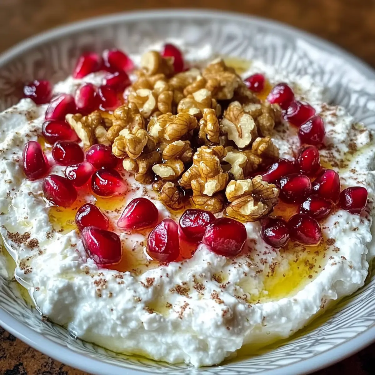 - Gently fold in the pomegranate seeds and chopped walnuts into the creamy mixture.