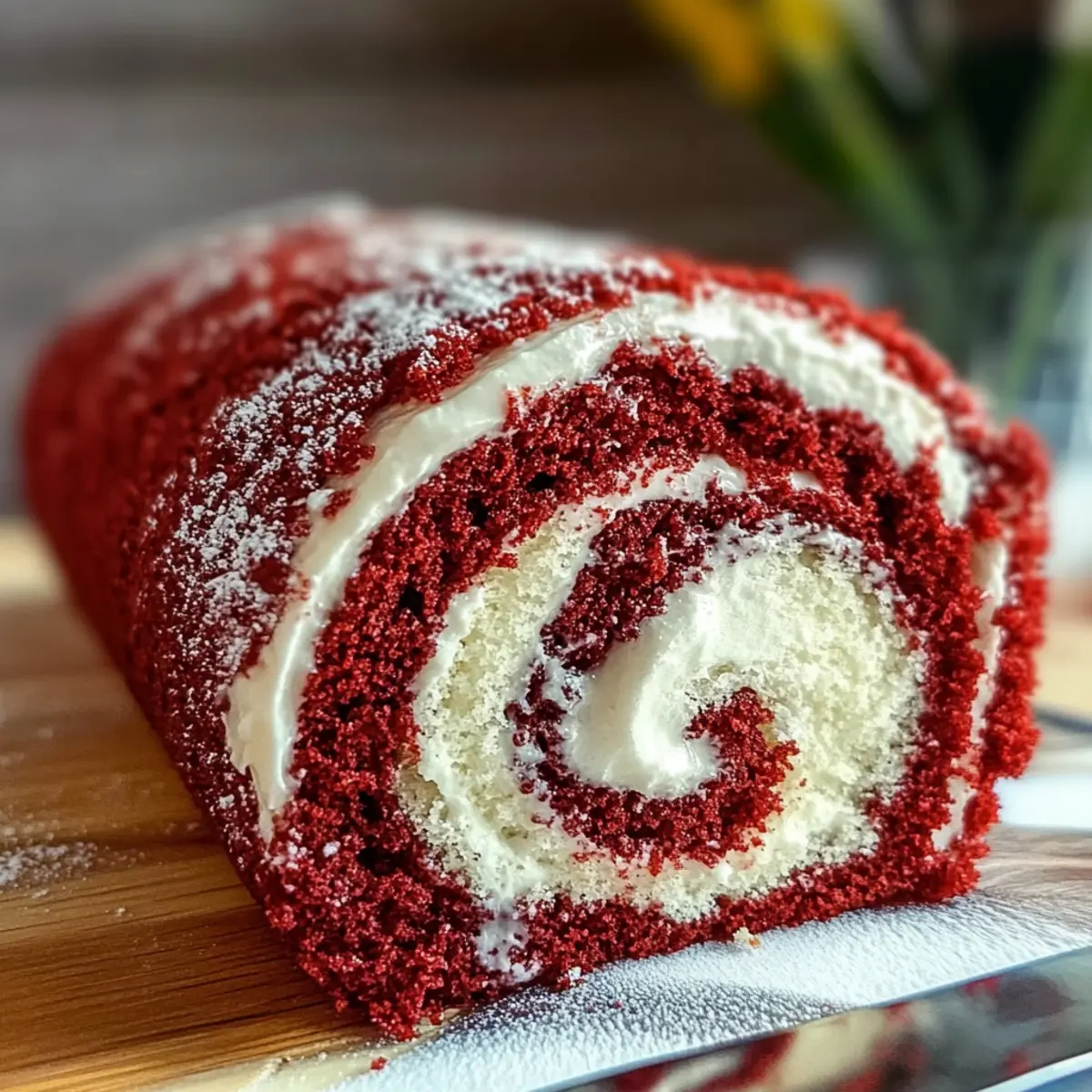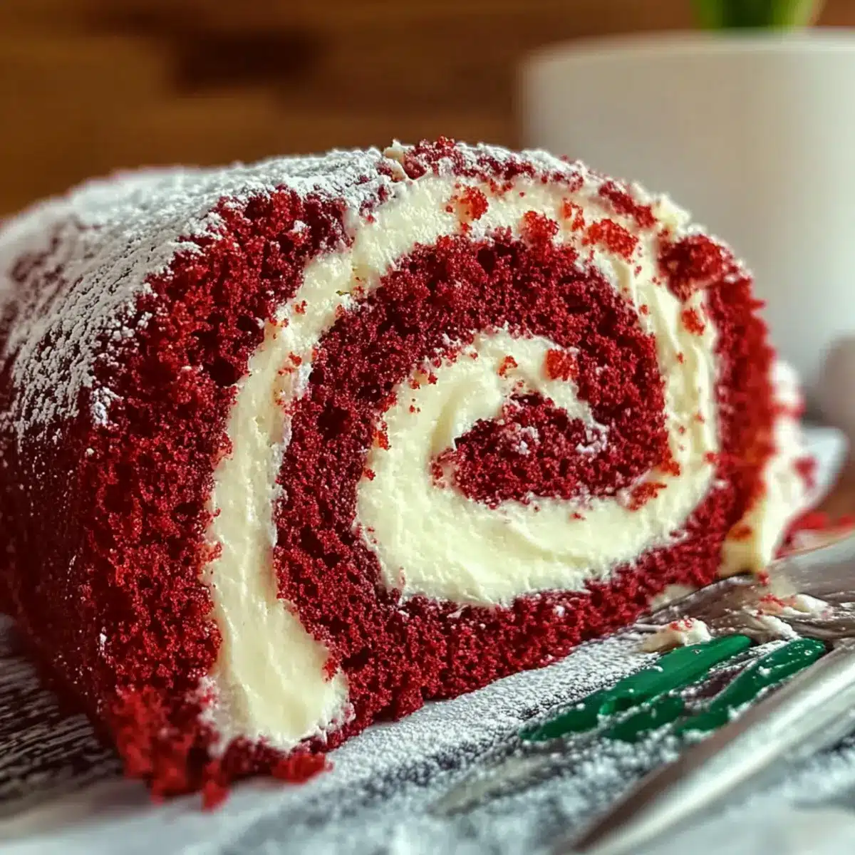 Before serving, dust the top of the chilled Red Velvet Cake Roll with additional powdered sugar to add a touch of sweetness and elegance. Slice into pieces and enjoy the beautiful swirls of cake and cream cheese filling—perfect for impressing guests!