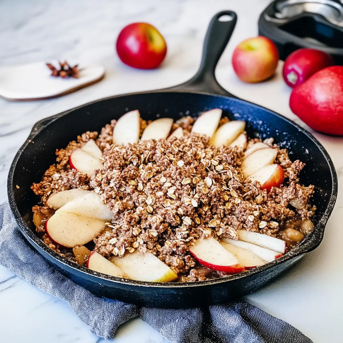- Layer the spiced apple slices in the skillet and sprinkle the oat topping over them.