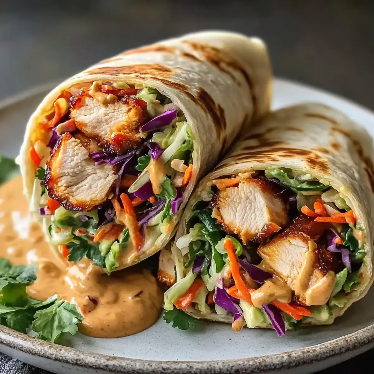 - Assemble the wraps by warming tortillas and spreading peanut sauce on each. Add slaw and sliced chicken, drizzle with more sauce, roll tightly, and slice diagonally to serve.