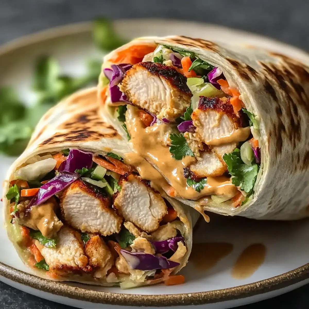 Warm the flour tortillas briefly in a dry pan or microwave to make them pliable. Spread a generous amount of peanut sauce on each tortilla, then layer on a handful of the crunchy Asian slaw and sliced chicken. Drizzle with extra peanut sauce for added flavor, then roll the tortilla tightly, folding the ends in as you go. Slice the wraps diagonally for easy serving and enjoy your homemade Thai Chicken Wrap!