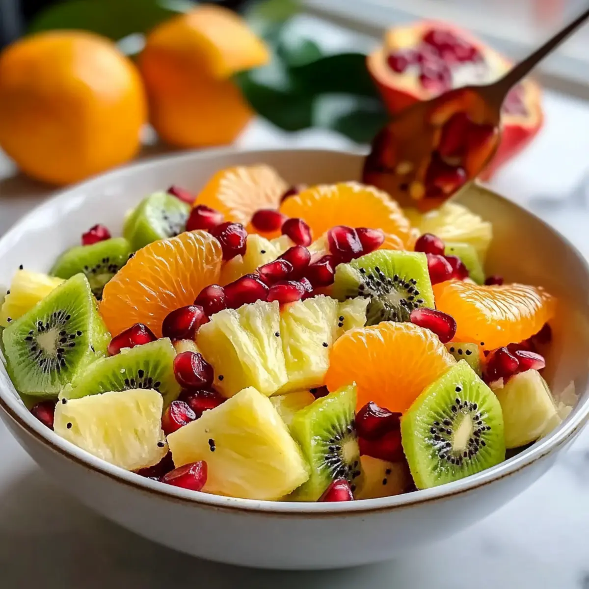 - Prepare the Fruit: Cut the pineapple into bite-sized cubes and place them in a large mixing bowl. Add the sliced kiwis, peeled mandarin orange segments, and sprinkle the pomegranate arils over the fruit.